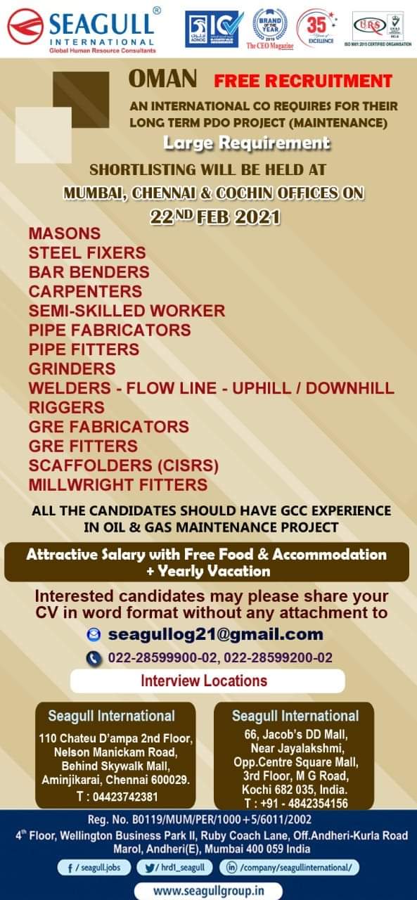 OMAN FREE RECRUITMENTAN INTERNATIONAL CO REQUIRES FOR THEIRLONG TERM PDO PROJECT (MAINTENANCE)SHORTLISTING WILL BE HELD ATMUMBAI; CHENNAI & COCHIN OFFICES …