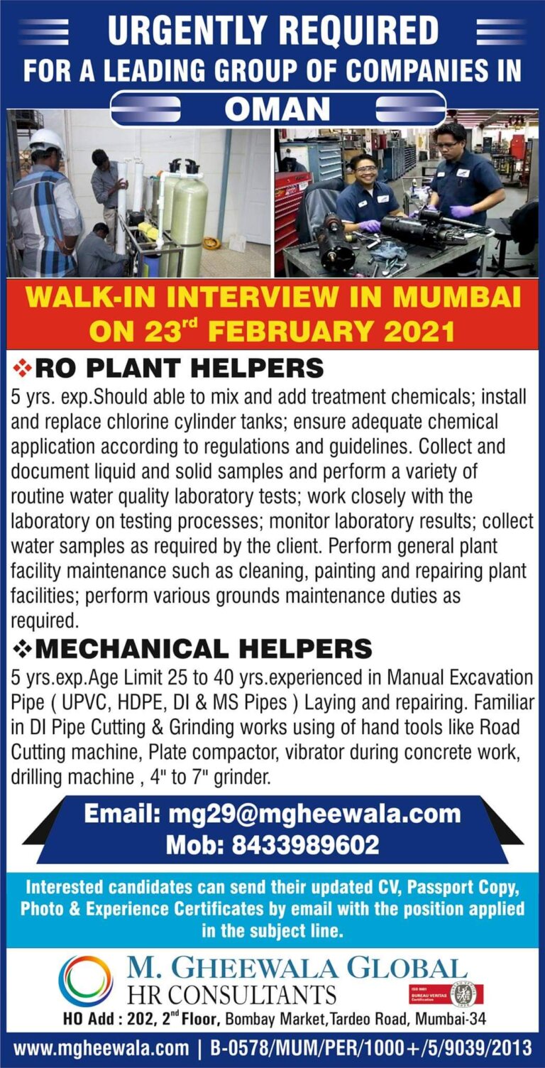 URGENTLY REQUIREDFOR A LEADING GROUP OF COMPANIES INOMANWALK-IN INTERVIEW IN MUMBAION 23rd FEBRUARY 2021RO PLANT HELPERS5 yrs. exp.Should able to …