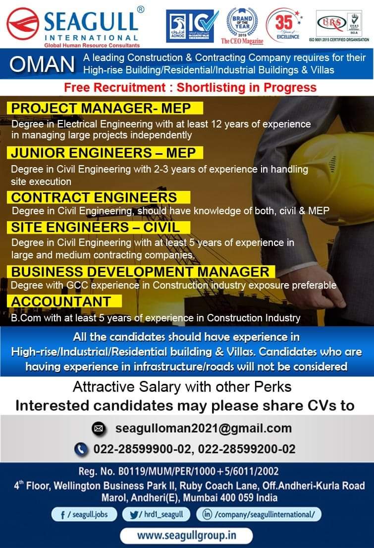 A leading Construction & Contracting Company requires for theirOMANHigh-rise Building/Residential/lndustrial Buildings & VillasFree Recruitment : Shortlisting in ProgressPROJECT MANAGER- MEPDegree …