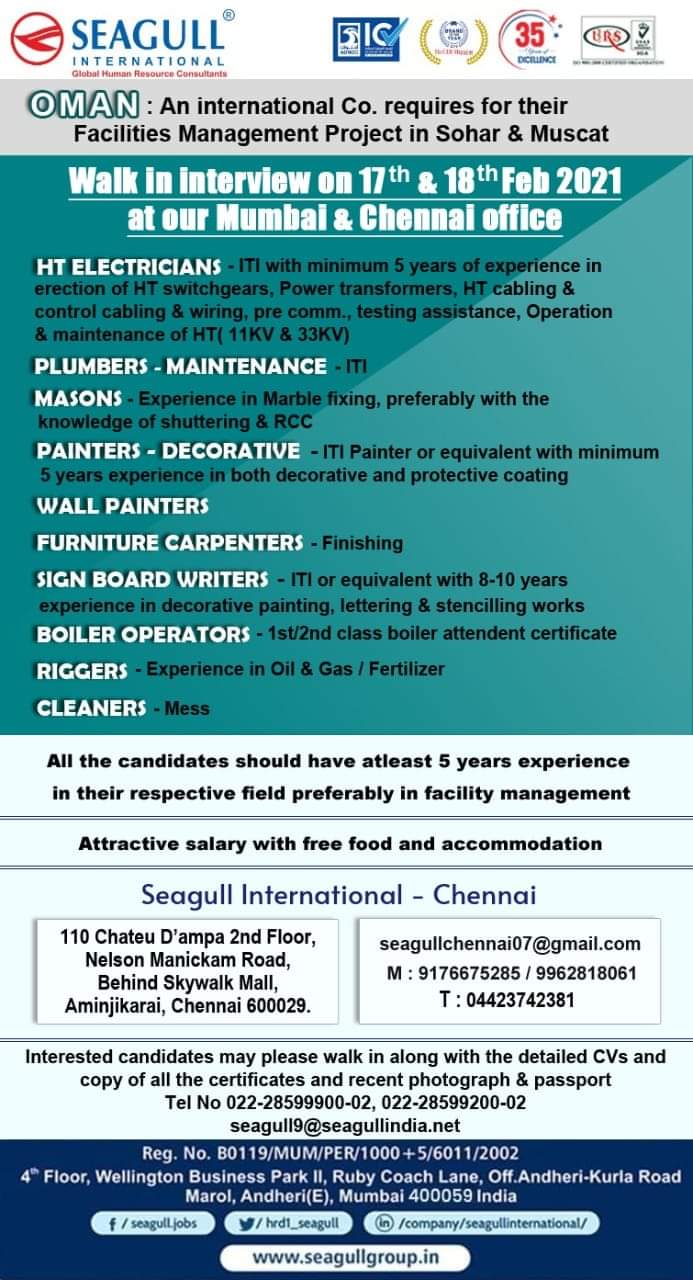 : An international Co. requires for theirFacilities Management Project in Sohar & MuscatWalk in interview on 17th & 18th Feb …