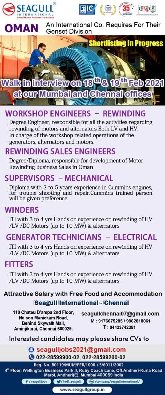 An International Co. Requires For Their OMANGenset DivisionShortlisting in ProgressWalk in ihtervieW on 18 lyth Feb 2021at our Mumbai and …