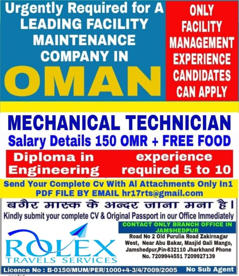 Urgently Required for A ONLYLEADING FACILITYMAINTENANCECOMPANY INFACILITYMANAGEMENTEXPERIENCEOMANCANDIDATESCAN APPLYMECHANICAL TECHNICIANsalary Details 150 OMR + FREE FOODexperienceDiploma inEngineering required 5 to 10Send …