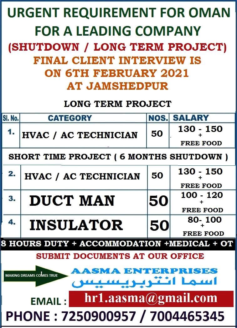 URGENT REQUIREMENT FOR OMANFOR A LEADING COMPANY(SHUTDOWN / LONG TERM PROJECT)FINAL CLIENT INTERVIEW ISON 6TH FEBRUARY 2021AT JAMSHEDPURLONG TERM PROJECTCATEGORYNOS. …