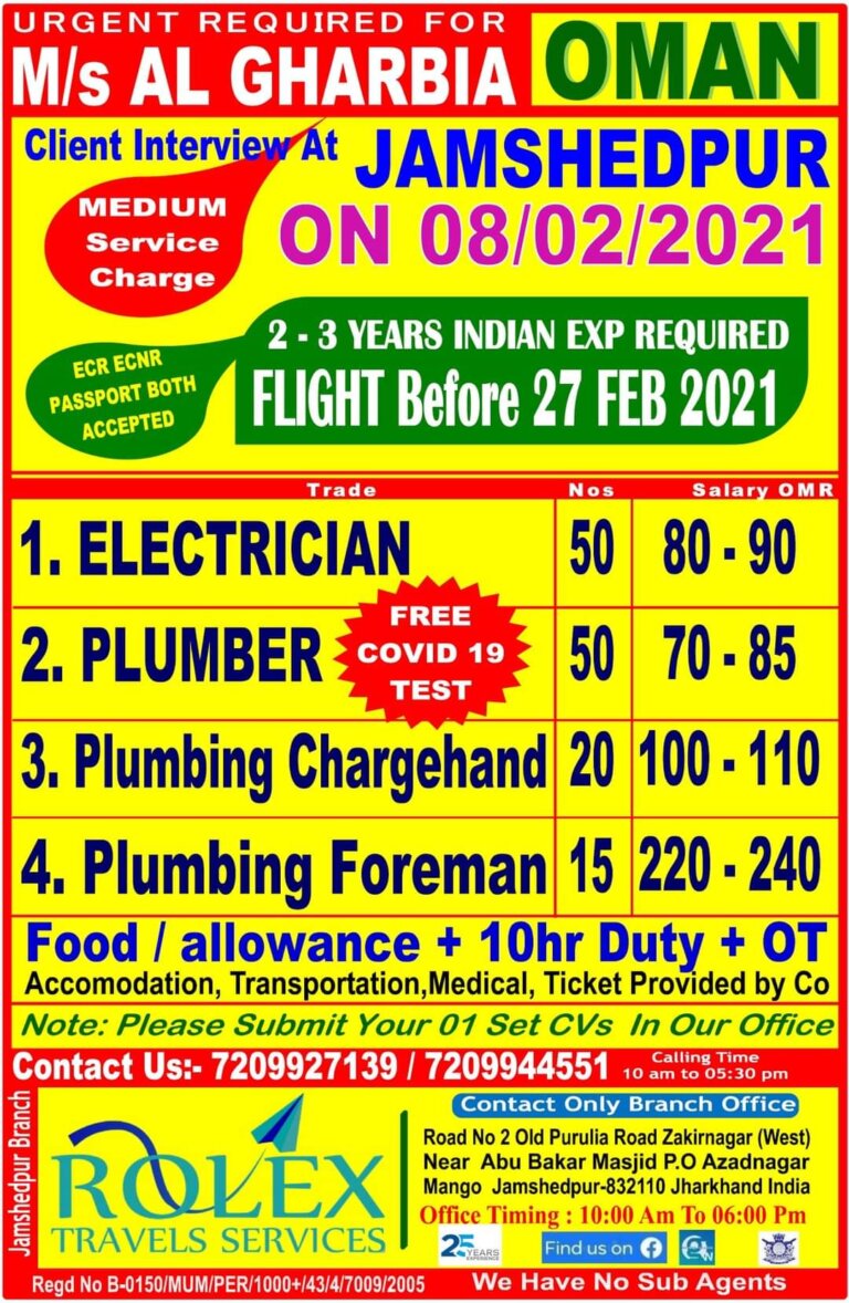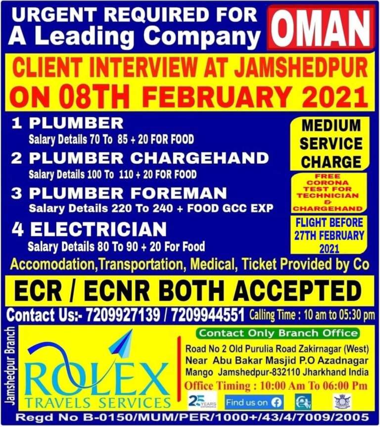 URGENT REQUIRED FOROMANServiceChargeECRECNRPASSPORT BOTHACCEPTED2 – 3 YEARS INDIAN EXP REQUIREDFLIGHT Before 27 FEB 2021T rad el. ELECTRICIANFREE21 PLUMBERCOVID 19TESTNosSalar OMR50 …