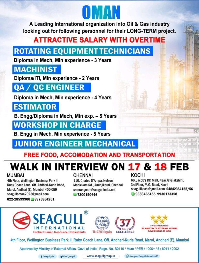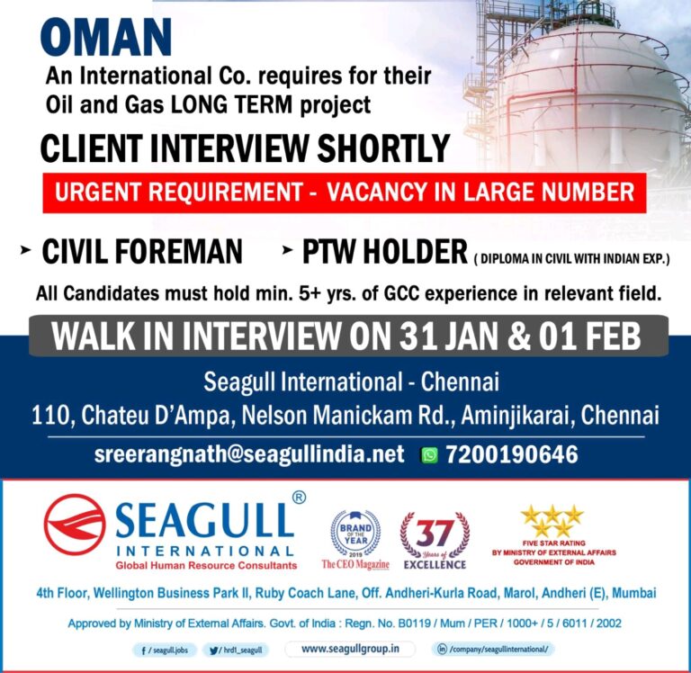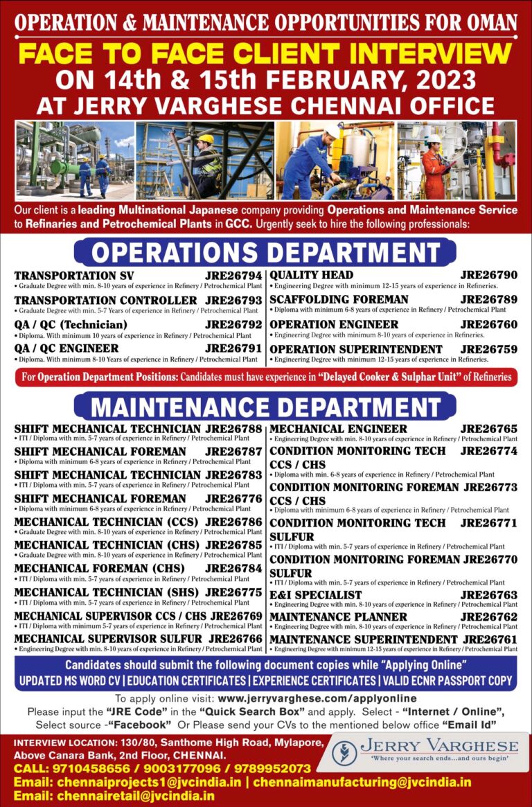 OPERATION & MAINTENANCE OPPORTUNITIES FOR OMANFACE TO FACE CLIENT INTERVIEWON 14th & 15th FEBRUARY, 2023AT JERRY VARGHESE CHENNAI OFFICEOur client …