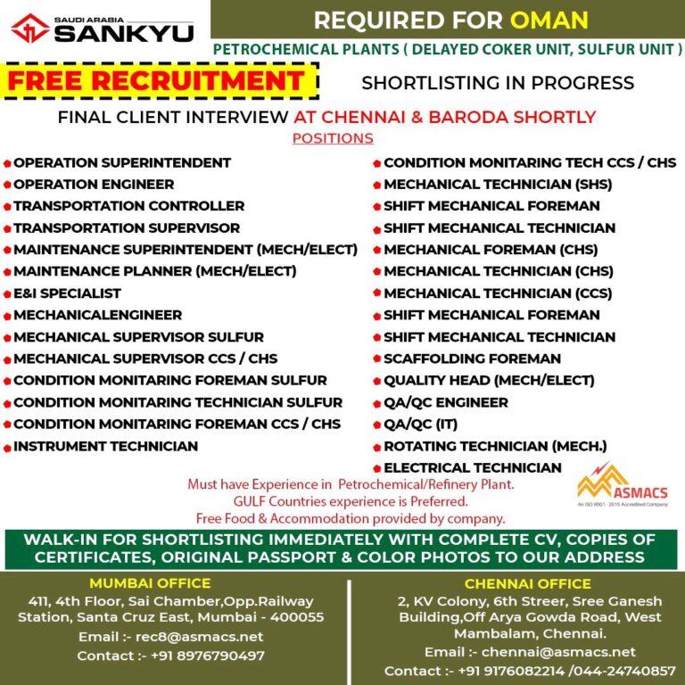 REQUIRED FOR OMANPETROCHEMICAL PLANTS (DELAYED COKER UNIT, SULFUR UNIT)FREE RECRUITMENT i SHORTLISTING IN PROGRESSFINAL CLIENT INTERVIEW AT CHENNAI & BARODA …