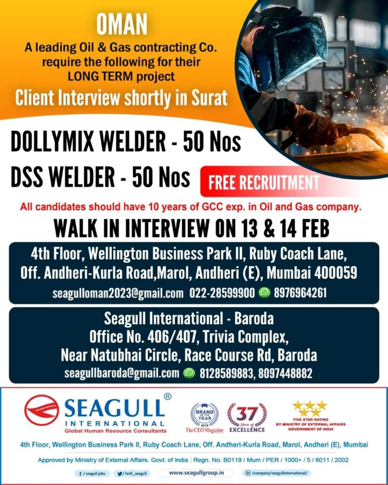 OMANA leading Oil & Gas contracting Co.require the following for theirLONG TERM projectClient Interview shortly in SuratDOLLYMIX WELDER – 50DSS …