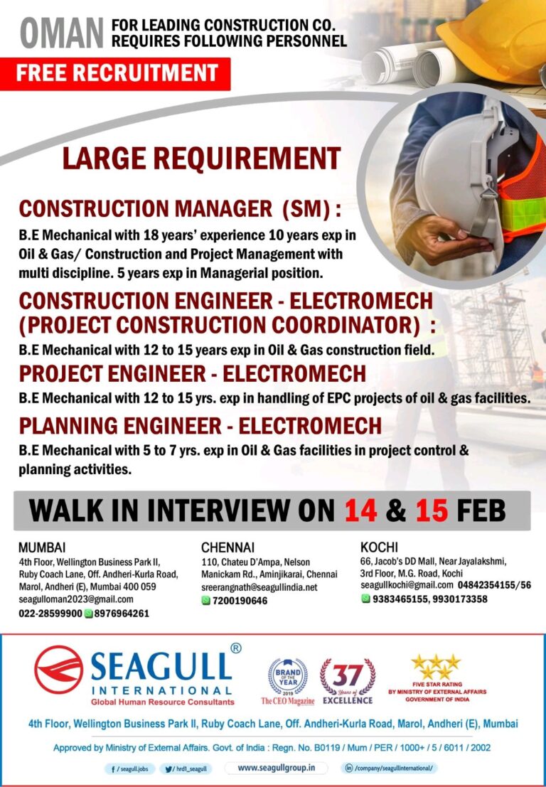 OMANFOR LEADING CONSTRUCTION CO.REQUIRES FOLLOWING PERSONNELFREE RECRUITMENTLARGE REQUIREMENTCONSTRUCTION MANAGER (SM) :B.E Mechanical with 18 years’ experience 10 years exp inOil …