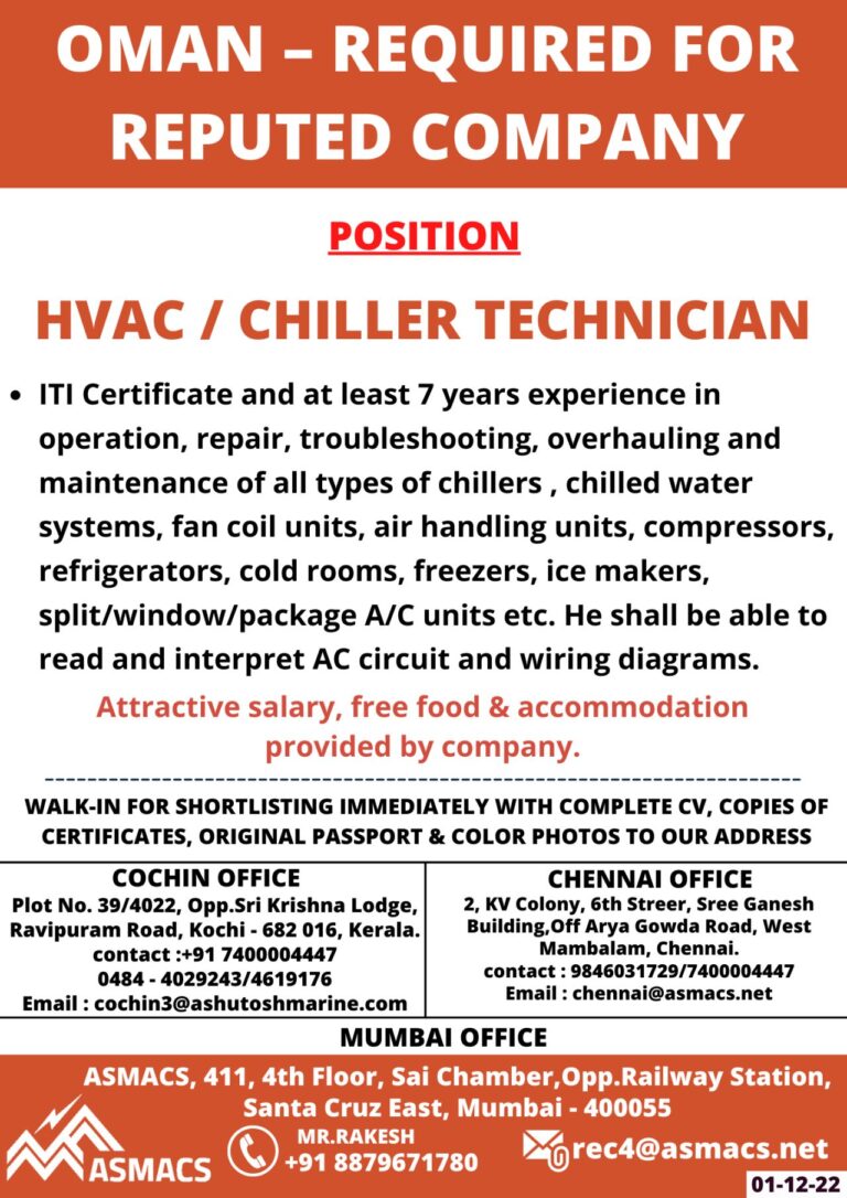 OMAN – REQUIRED FORREPUTED COMPANYPOSITIONHVAC / CHILLER TECHNICIAN• ITI Certificate and at least 7 years experience inoperation, repair, troubleshooting, overhauling …