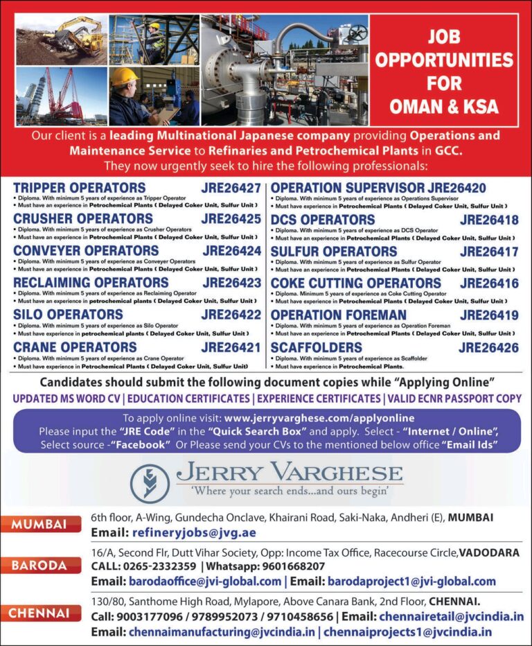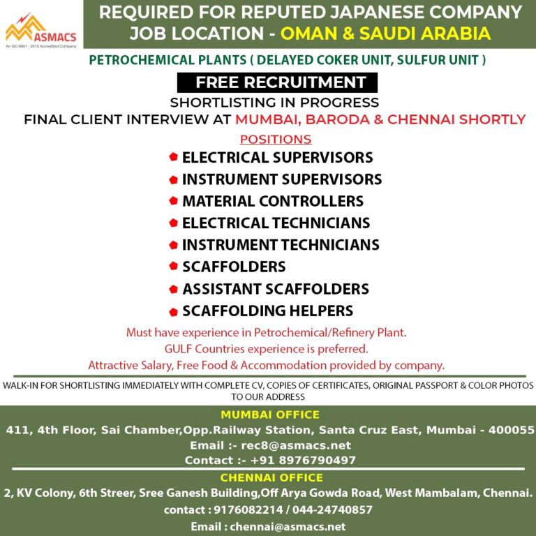 REQUIRED FOR REPUTED JAPANESE COMPANYJOB LOCATION – OMAN & SAUDI ARABIAPETROCHEMICAL PLANTS ( DELAYED COKER UNIT, SULFUR UNIT )FREE RECRUITMENTSHORTLISTING …