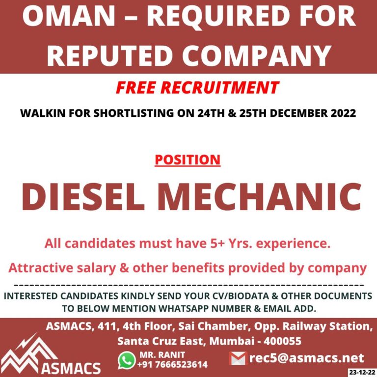 OMAN – REQUIRED FORREPUTED COMPANYFREE RECRUITMENTWALKIN FOR SHORTLISTING ON 24TH & 25TH DECEMBER 2022DIESEL MECHANICPOSITIONAll candidates must have 5+ Yrs. …