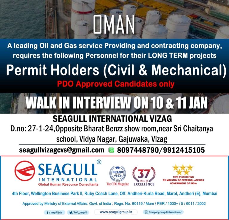 OMANA leading Oil and Gas service Providing and contracting company,requires the following Personnel for their LONG TERM projectsPermit Holders (Civil …