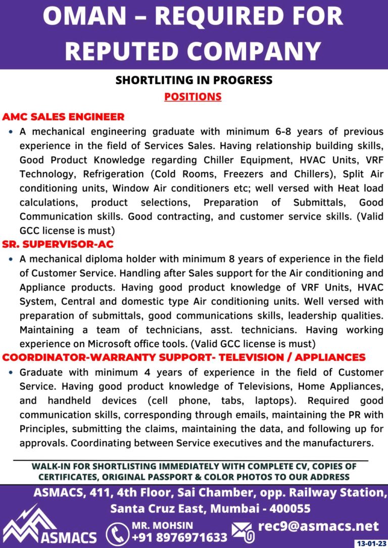 OMAN – REQUIRED FORREPUTED COMPANYSHORTLITING IN PROGRESSPOSITIONSAMC SALES ENGINEER• A mechanical engineering graduate with minimum 6-8 years of previousexperience in …