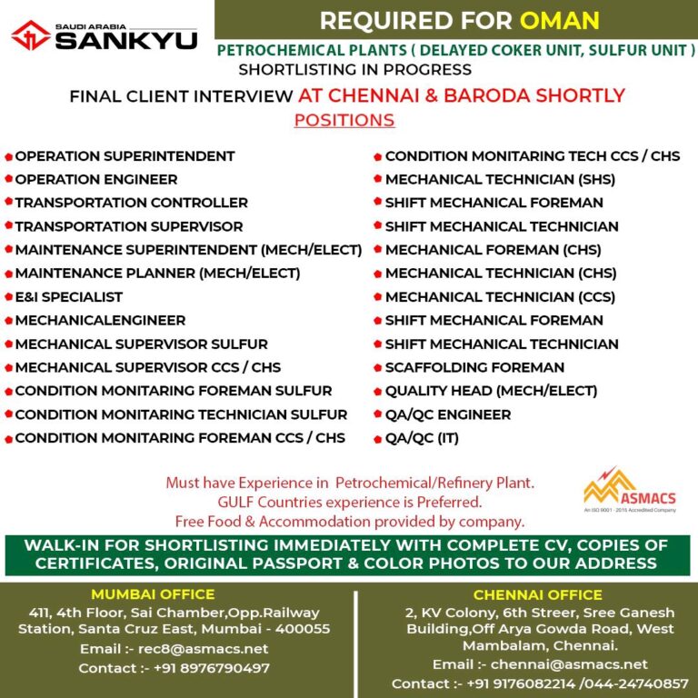 REQUIRED FOR OMANPETROCHEMICAL PLANTS (DELAYED COKER UNIT, SULFUR UNIT)SHORTLISTING IN PROGRESSFINAL CLIENT INTERVIEW AT CHENNAI & BARODA SHORTLYPOSITIONSOPERATION SUPERINTENDENTOPERATION ENGINEERTRANSPORTATION …