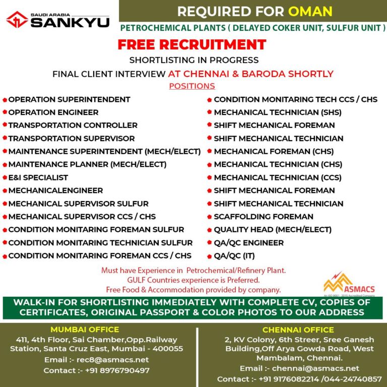 REQUIRED FOR OMANPETROCHEMICAL PLANTS (DELAYED COKER UNIT, SULFUR UNIT)FREE RECRUITMENTSHORTLISTING IN PROGRESSFINAL CLIENT INTERVIEW AT CHENNAI & BARODA SHORTLYOPERATION SUPERINTENDENTOPERATION …