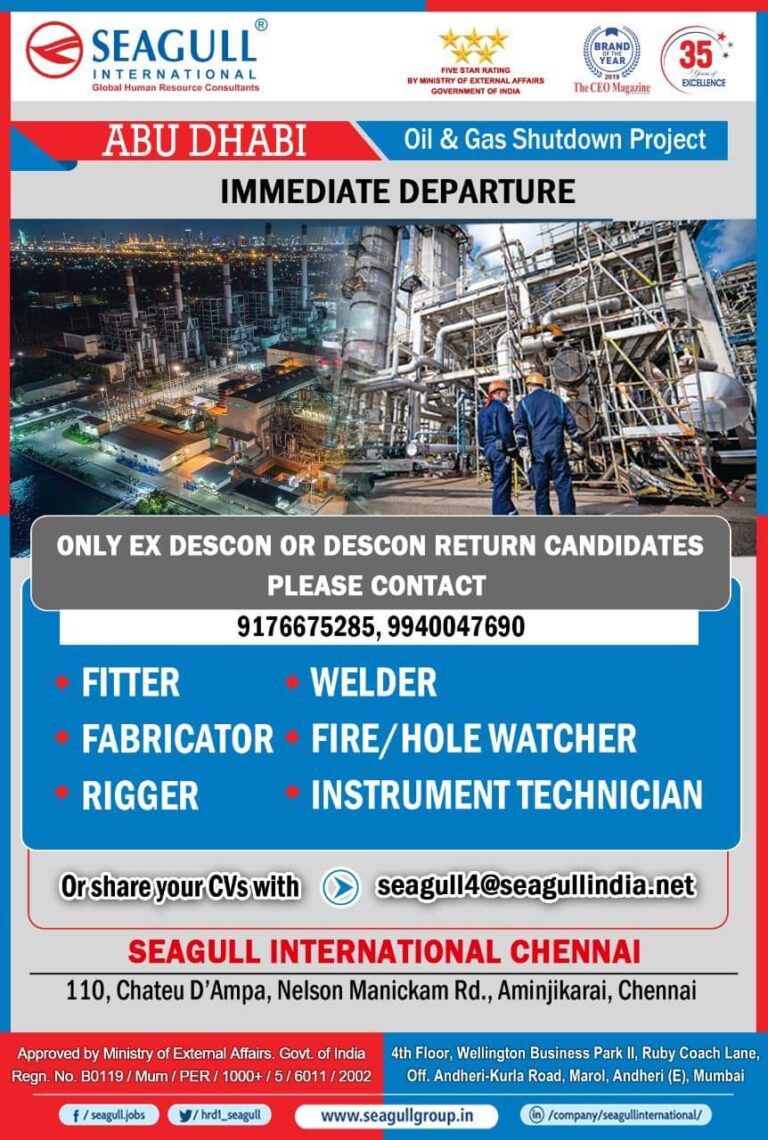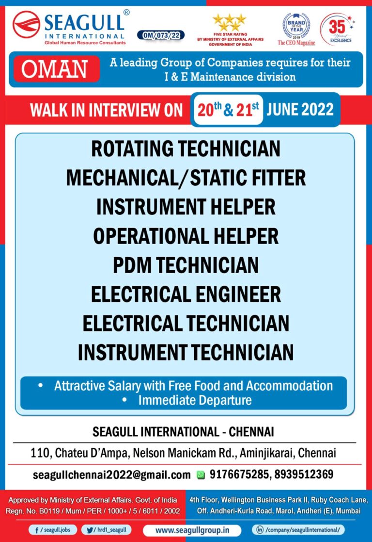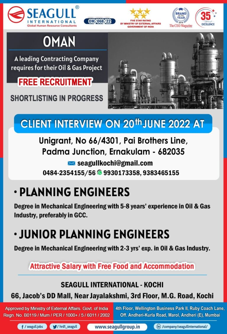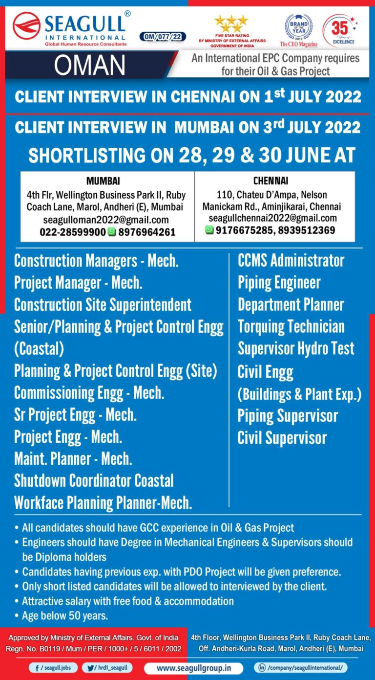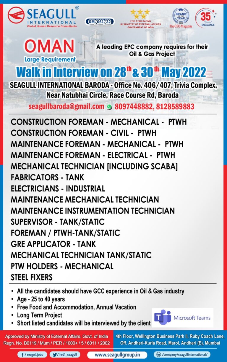 OMAN Large RequirementA leading EPC company requires for theirOil & Gas ProjectWaik in Interview on28tha 30th May2022SEAGULL INTERNATIONAL BARODA – …