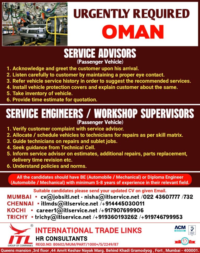 URGENTLY REQUIRED OMANSERVICE ADVISORS(Passenger Vehicle) Acknowledge and greet the customer upon his arrival. Listen carefully to customer by maintaining a …