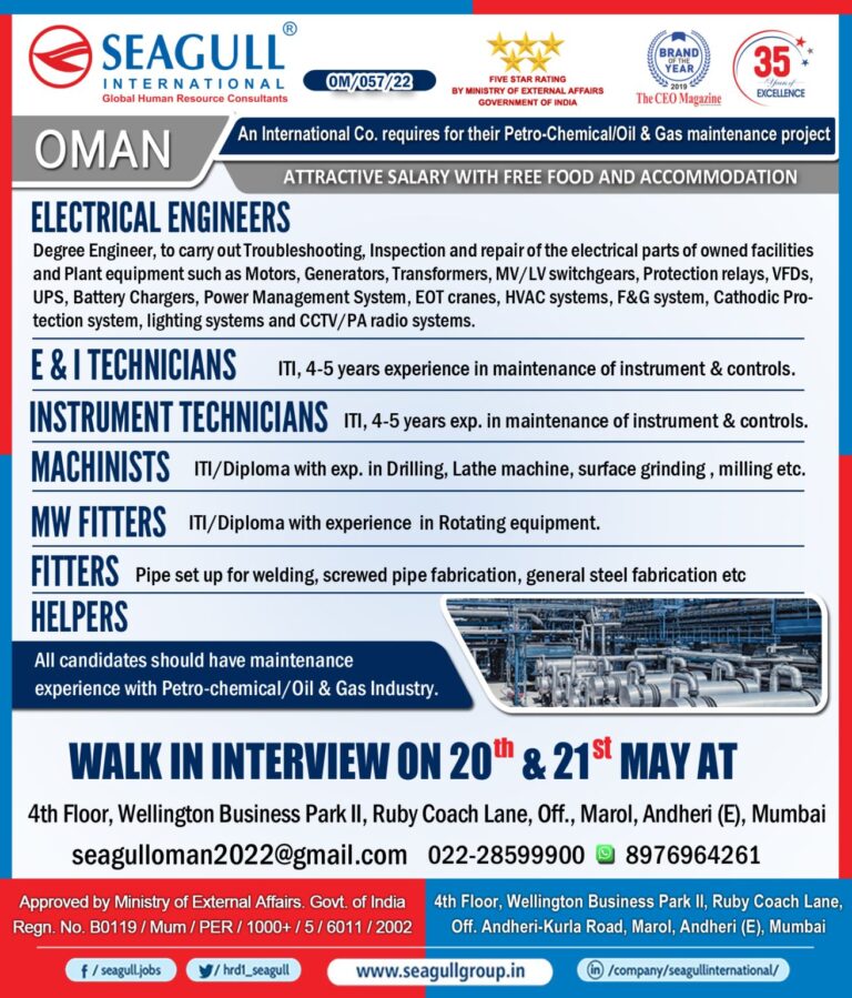 An International Co. requires for their Pietro-Chemical Oil & Gas maintenance projectOMANATTRACTIVE SALARY WITH FREE FOOD AND ACCOMMODATIONELECTRICAL ENGINEERSDegree Engineer, …