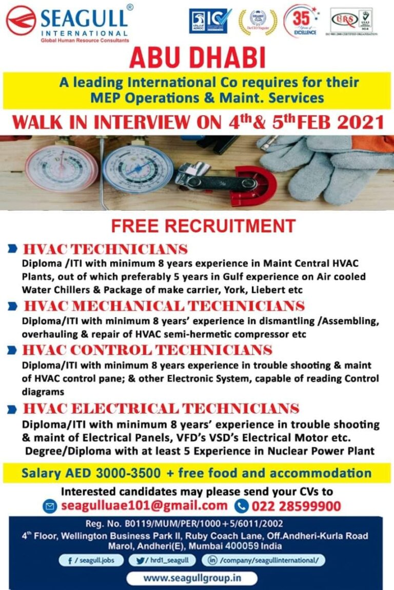 ABU DHABIA leading International Co requires for theirMEP Operations & Maint. ServicesWALK IN INTERVIEW ON 4th& 5thFEB 2021FREE RECRUITMENTHVAC TECHNICIANSDiploma …