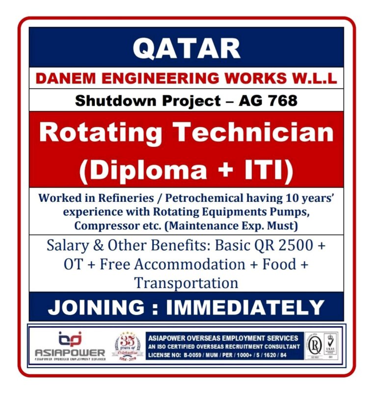 QATARDANEM ENGINEERING WORKS W.L.LShutdown Project — AG 768Rotating Technician(Diploma + ITI)Worked in Refineries / Petrochemical having 10 years’experience with Rotating …