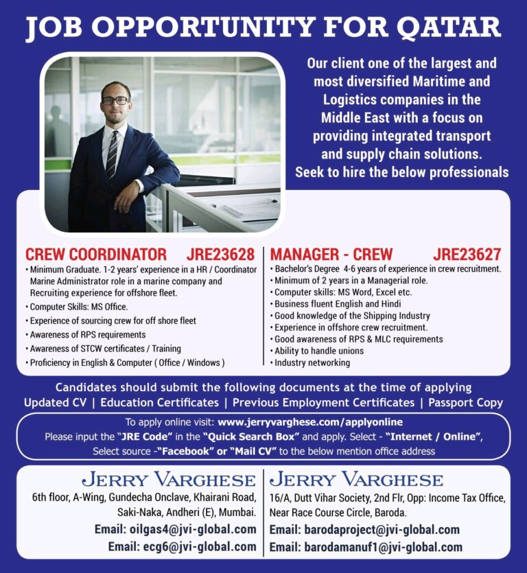 JOB OPPORTUNITY FOR QATARCREW COORDINATOR JRE23628• Minimum Graduate. 1-2 years’ experience in a HR / CoordinatorMarine Administrator role in a …