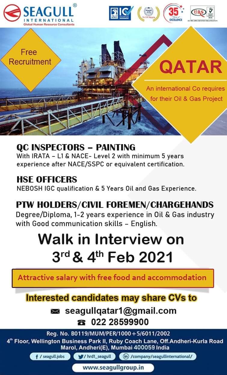 Free Recruitment QATARAn international Co requiresfor their Oil & Gas ProjectQC INSPECTORS – PAINTINGWith IRATA — Ll & NACE- Level …