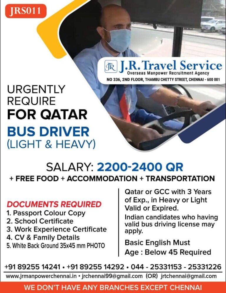 URGENTLY REQUIRED FOR QATARBUS DRIVER (LIGHT & HEAVY)@J.R. Travel ServiceOverseas Manpower Recruitment AgencyNO 336, 2ND FLOOR, THAMBU CHETTY STREET, CHENNAI …