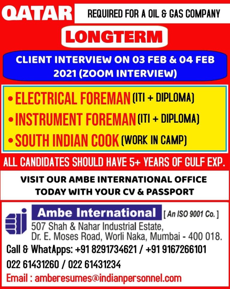 QATAR REQUIRED FOR A OIL GAS COMPANYLONG TERMCLIENT INTERVIEW ON 03 FEB & 04 FEB2021 (zoom INTERVIEW)ELECTRICAL FOREMAN+ DIPLOMA)INSTRUMENT FOREMAN+ …