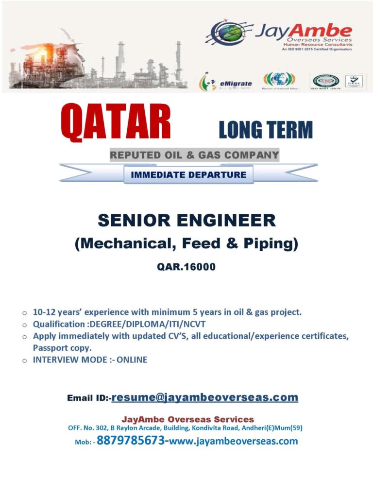 REPUTED OIL & GAS COMPANYIMMEDIATE DEPARTURESENIOR ENGINEER(Mechanical, Feed & Piping)QAR.160000 10-12 years’ experience with minimum 5 years in oil & …
