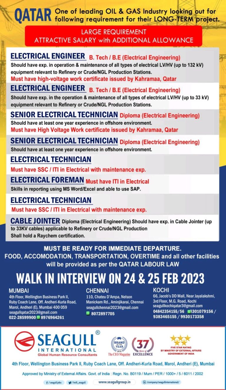 QATAR following requirement for their LONG-TERM project.LARGE REQUIREMENTATTRACTIVE SALARY with ADDITIONAL ALLOWANCECLIENT INTERVIEW ON 03 MAR 2023 AT MUMBAIELECTRICAL ENGINEER …