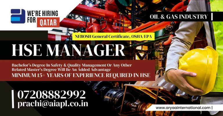 FOR QATARNEBOSH General Certificate, OSHA/EPAHSE MANAGEROIL & GAS INDUSTRYBachelor’s Degree In Safety & Quality Management Or Any OtherRelated Master’s Degree …