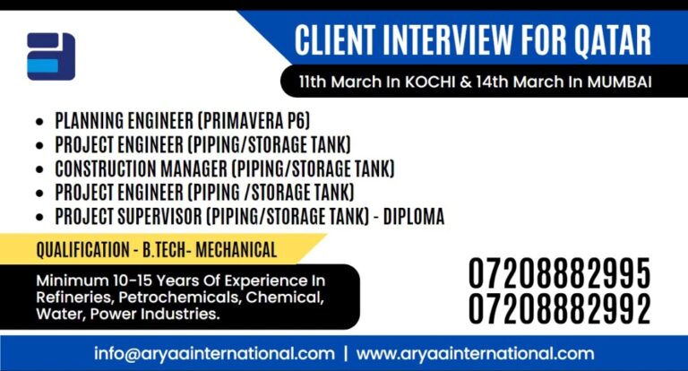 CLIENT INTERVIEW FOR QATAR11th March In KOCHI & 14th March In MUMBAI• PLANNING ENGINEER (PRIMAVERA P6)• PROJECT ENGINEER (PIPING/STORAGE TANK)CONSTRUCTION …