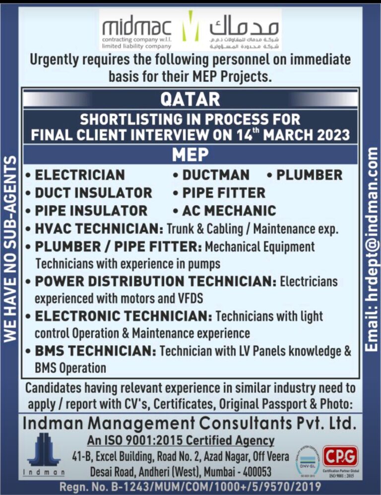 Urgently requires the following personnel on immediatebasis for their MEP Projects.QATARSHORTLISTING IN PROCESS FORFINAL CLIENT INTERVIEW ON 14th MARCH 2023MEPELECTRICIAN• …