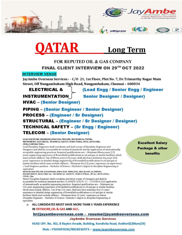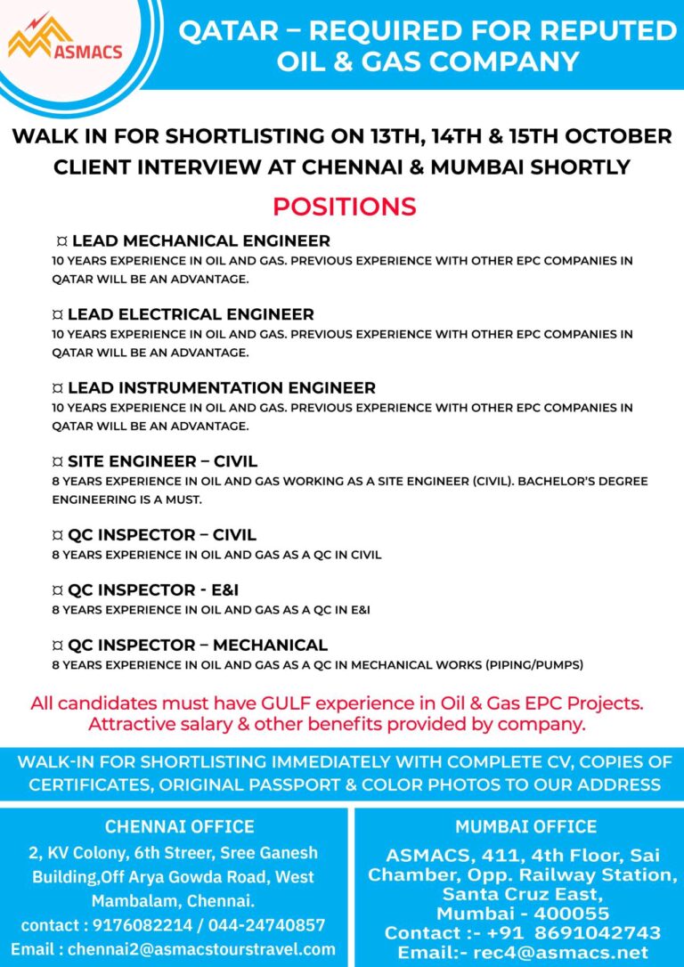 QATAR – REQUIRED FOR REPUTEDOIL & GAS COMPANYWALK IN FOR SHORTLISTING ON 13TH, 14TH & 15TH OCTOBERCLIENT INTERVIEW AT CHENNAI …