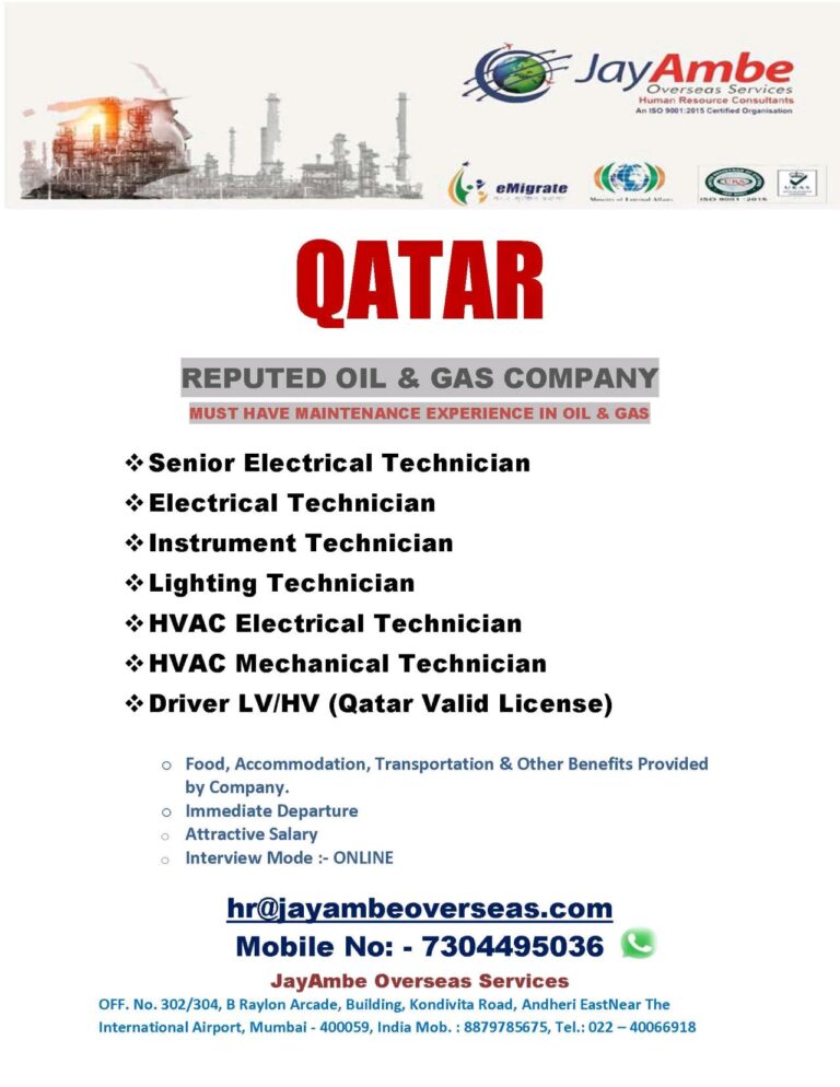 QATAR REPUTED OIL & GAS COMPANYHAVE MAINTENANCE EXPERIENCE IN OIL & GAS Senior Electrical TechnicianElectrical TechnicianInstrument TechnicianLighting Technician HVAC Electrical …