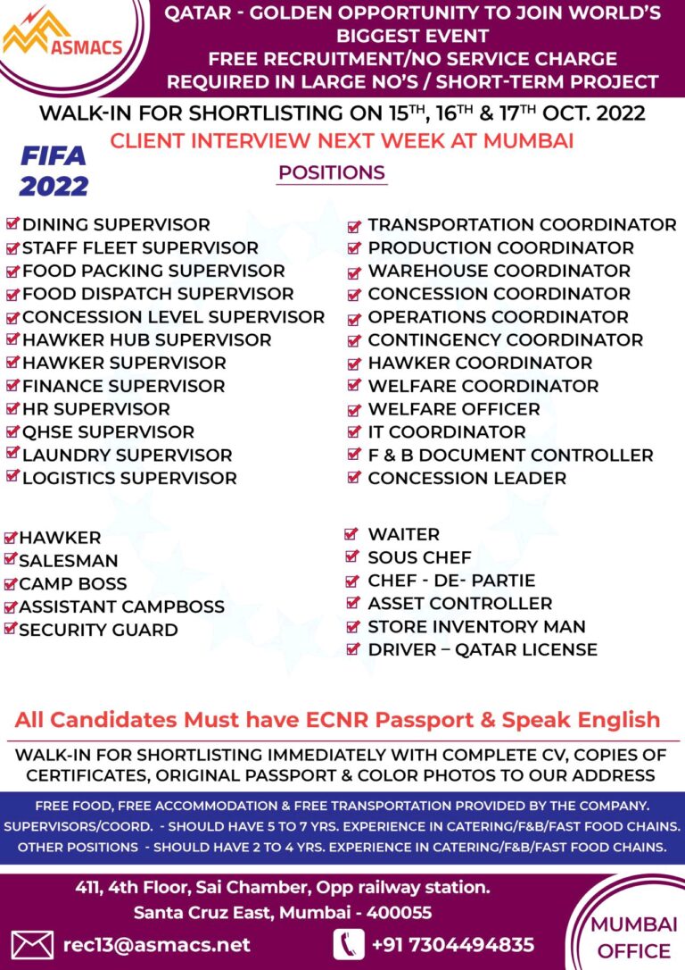 QATAR – GOLDEN OPPORTUNITY TO JOIN WORLD’SBIGGEST EVENTFREE RECRUITMENT/NO SERVICE CHARGEREQUIRED IN LARGE NO’S / SHORT-TERM PROJECTWALK-IN FOR SHORTLISTING ON …