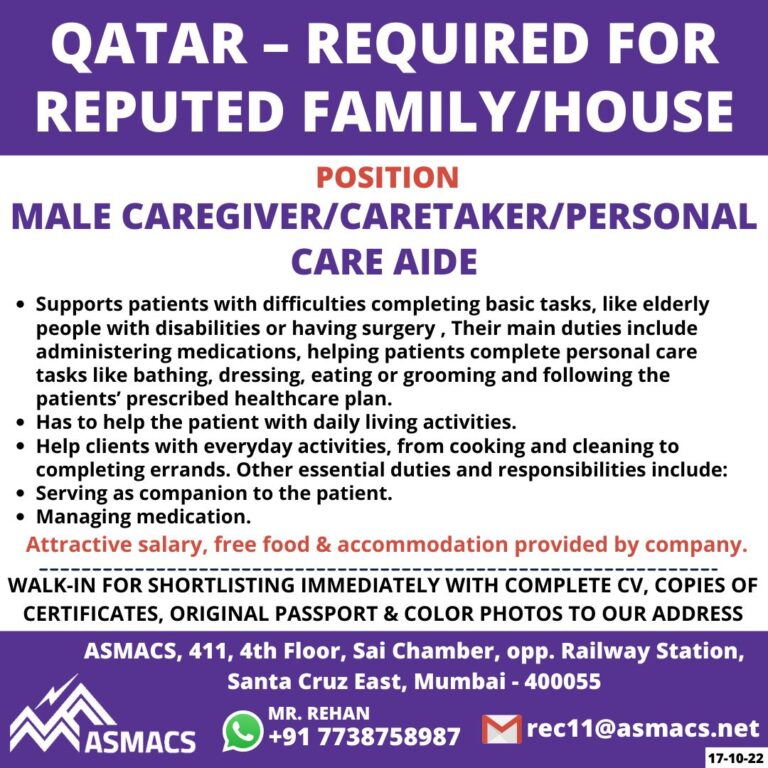 QATAR – REQUIRED FORREPUTED FAMILY/HOUSEPOSITIONMALE CAREGIVER/CARETAKER/PERSONALCARE AIDE• Supports patients with difficulties completing basic tasks, like elderlypeople with disabilities or having …