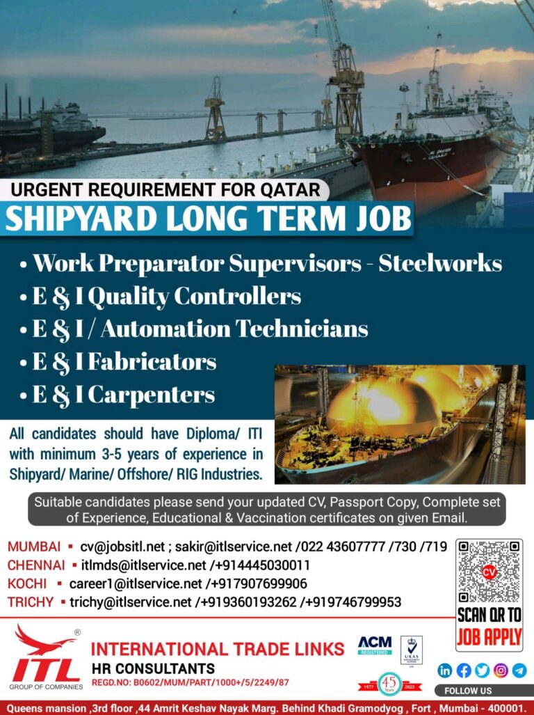 URGENT REQUIREMENT FOR QATARSHIPYARD LONG TERM JOB• Work Preparator Supervisors Steelworks• E I Quality Controllers• E I / Automation Technicians• …