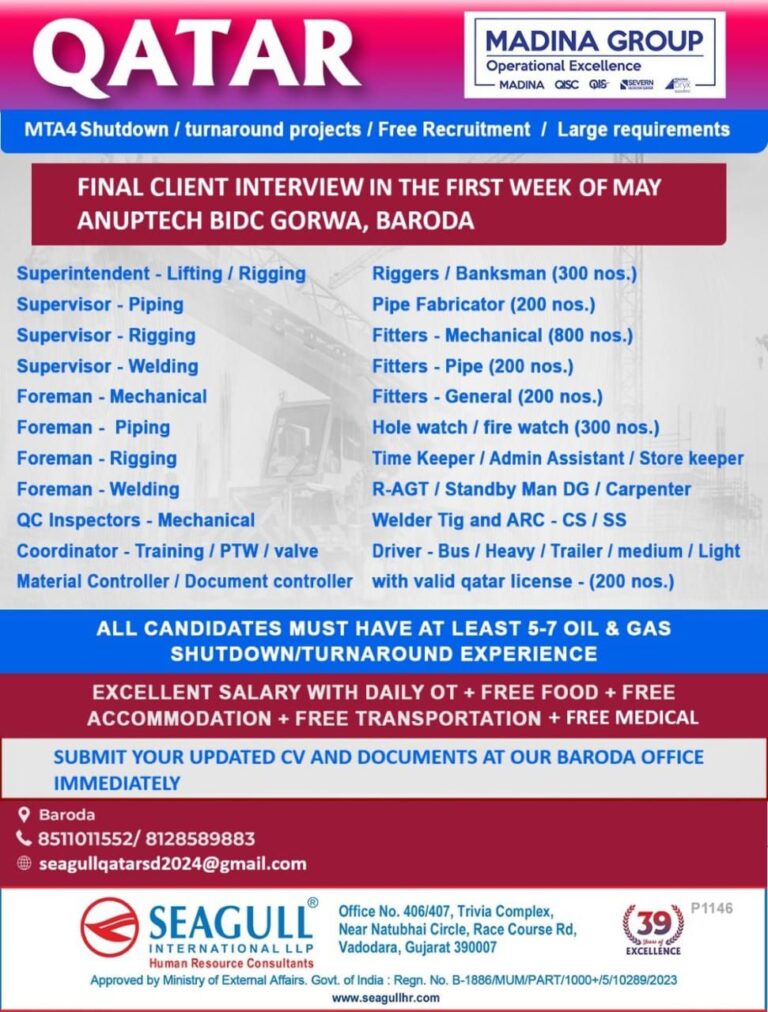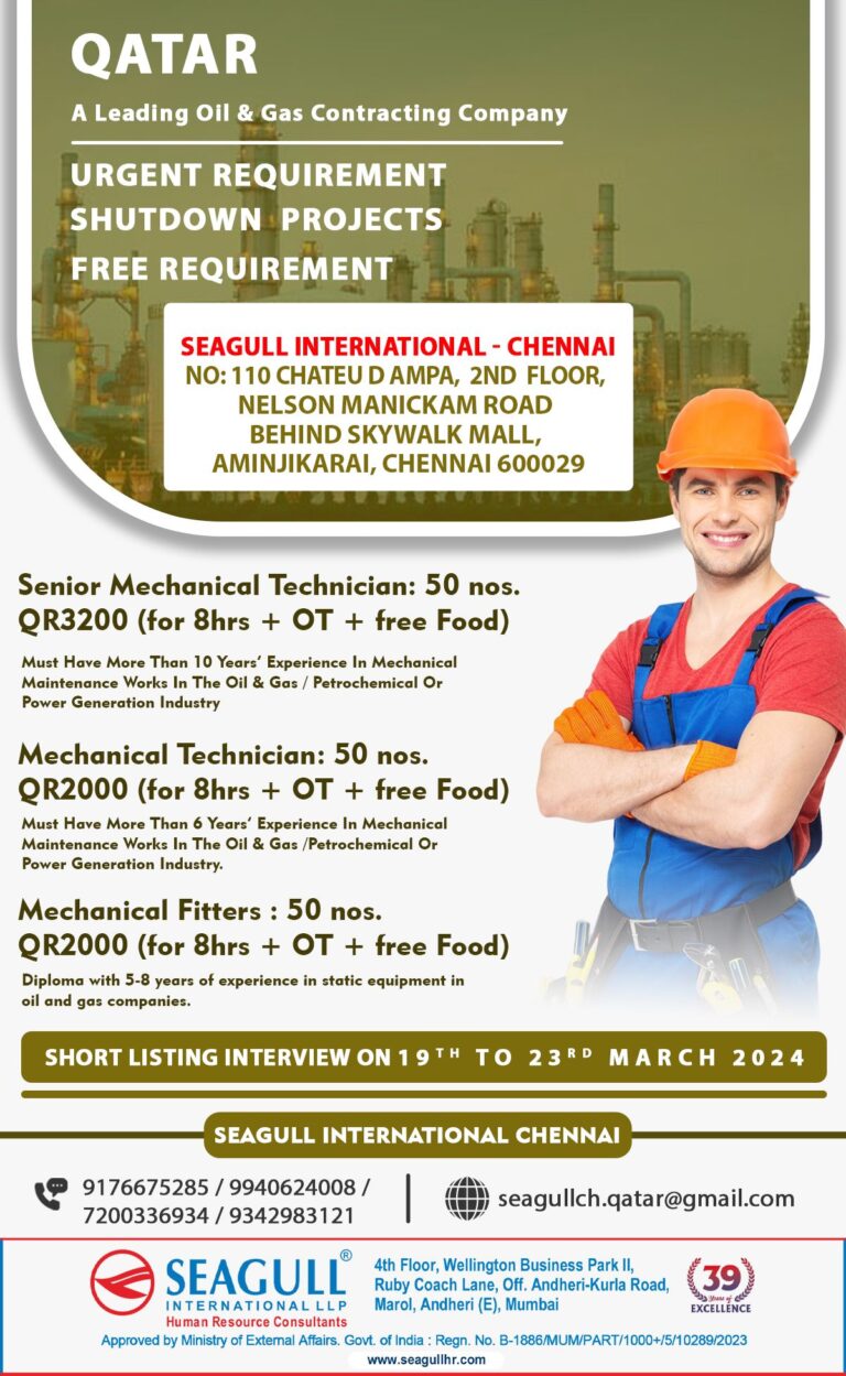 QATARA Leading Oil & Gas Contracting CompanyURGENT REQUIREMENTSHUTDOWN PROJECTSFREE REQUIREMENTSEAGULL INTERNATIONAL – CHENNAINO: 110 CHATEU D AMPA, 2ND FLOOR,NELSON MANICKAM …