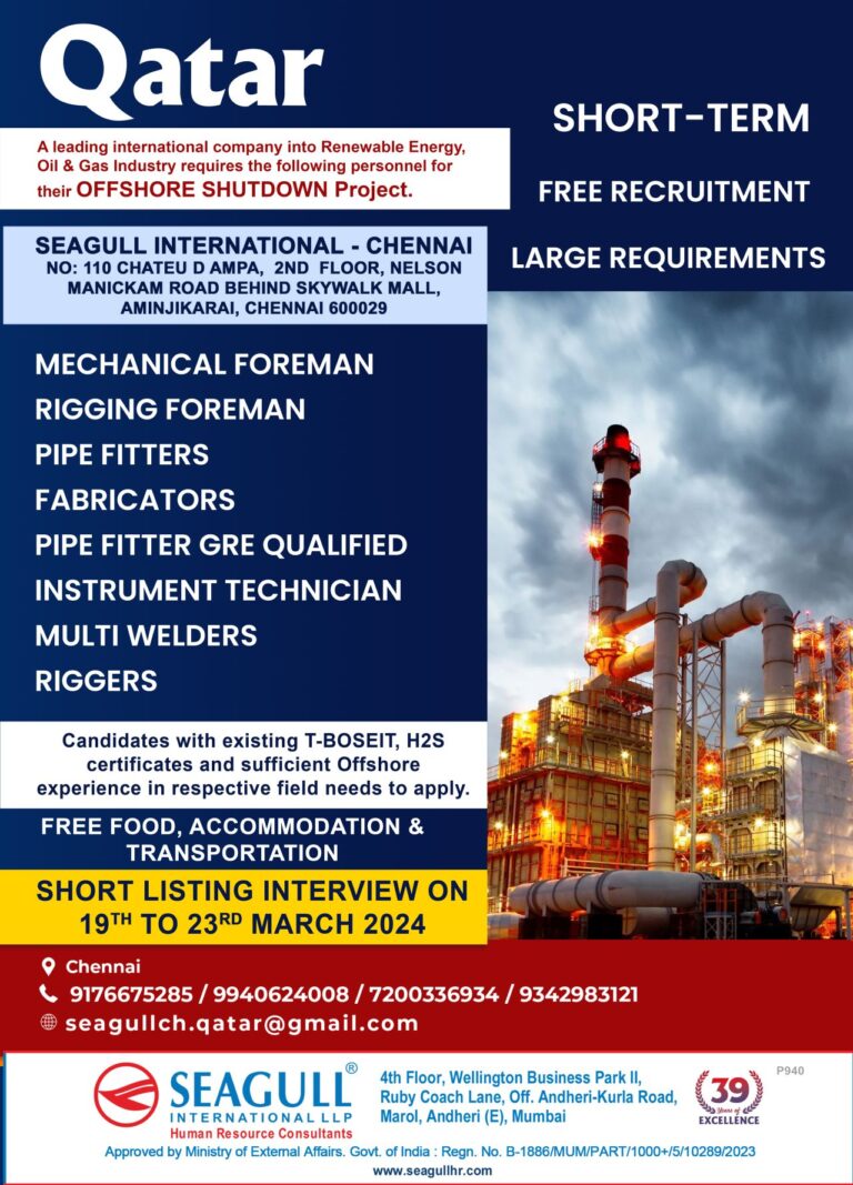 QatarA leading international company into Renewable Energy,Oil & Gas Industry requires the following personnel fortheir OFFSHORE SHUTDOWN Project.SEAGULL INTERNATIONAL – …