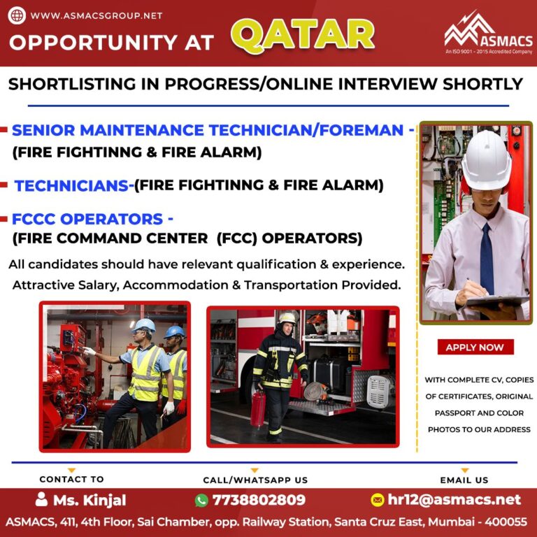 OPPORTUNITY AT QATARASMACSAn ISO 9001-2015 Accredited CompanySHORTLISTING IN PROGRESS/ONLINE INTERVIEW SHORTLY■ SENIOR MAINTENANCE TECHNICIAN/FOREMAN(FIRE FIGHTINNG & FIRE ALARM)■ TECHNICIANS-(FIRE FIGHTINNG …