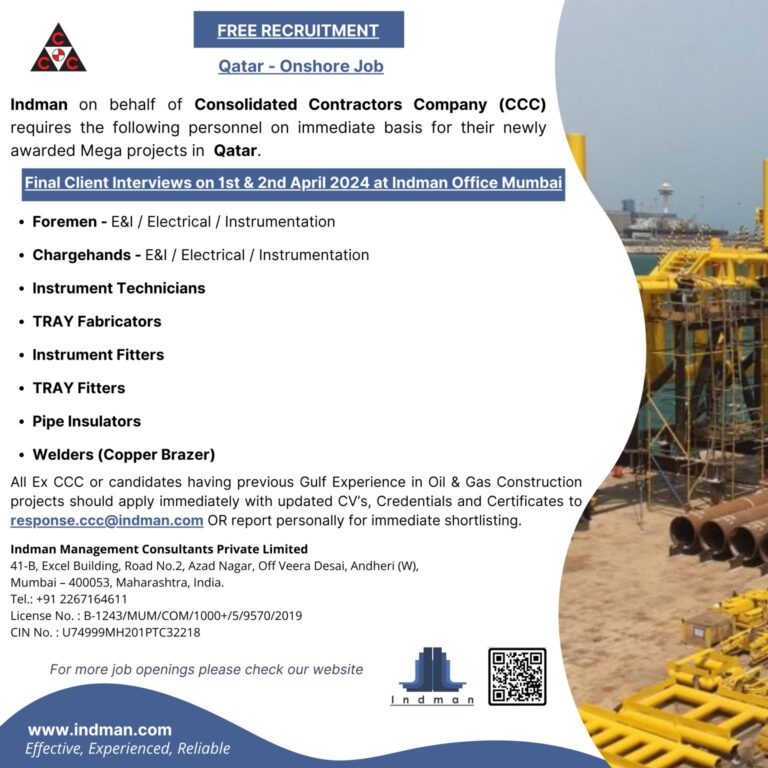 FREE RECRUITMENTQatar Onshore JobIndman on behalf of Consolidated Contractors Company (CCC)requires the following personnel on immediate basis for their newlyawarded …