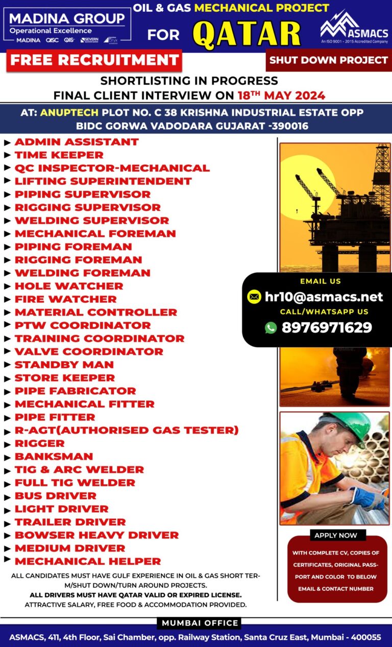 OIL & GAS MECHANICAL PROJECTFOR QATARFREE RECRUITMENTASMACSAn ISO 9001-2015 Accredited CompanySHUT DOWN PROJECTSHORTLISTING IN PROGRESSFINAL CLIENT INTERVIEW ON 18TH MAY …