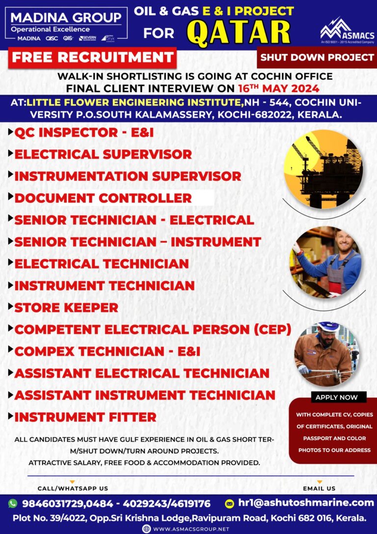 FREE RECRUITMENT QATARSHUT DOWN PROJECTWALK-IN SHORTLISTING IS GOING AT COCHIN OFFICEFINAL CLIENT INTERVIEW ON 16TH MAY 2024AT:LITTLE FLOWER ENGINEERING INSTITUTE,NH …