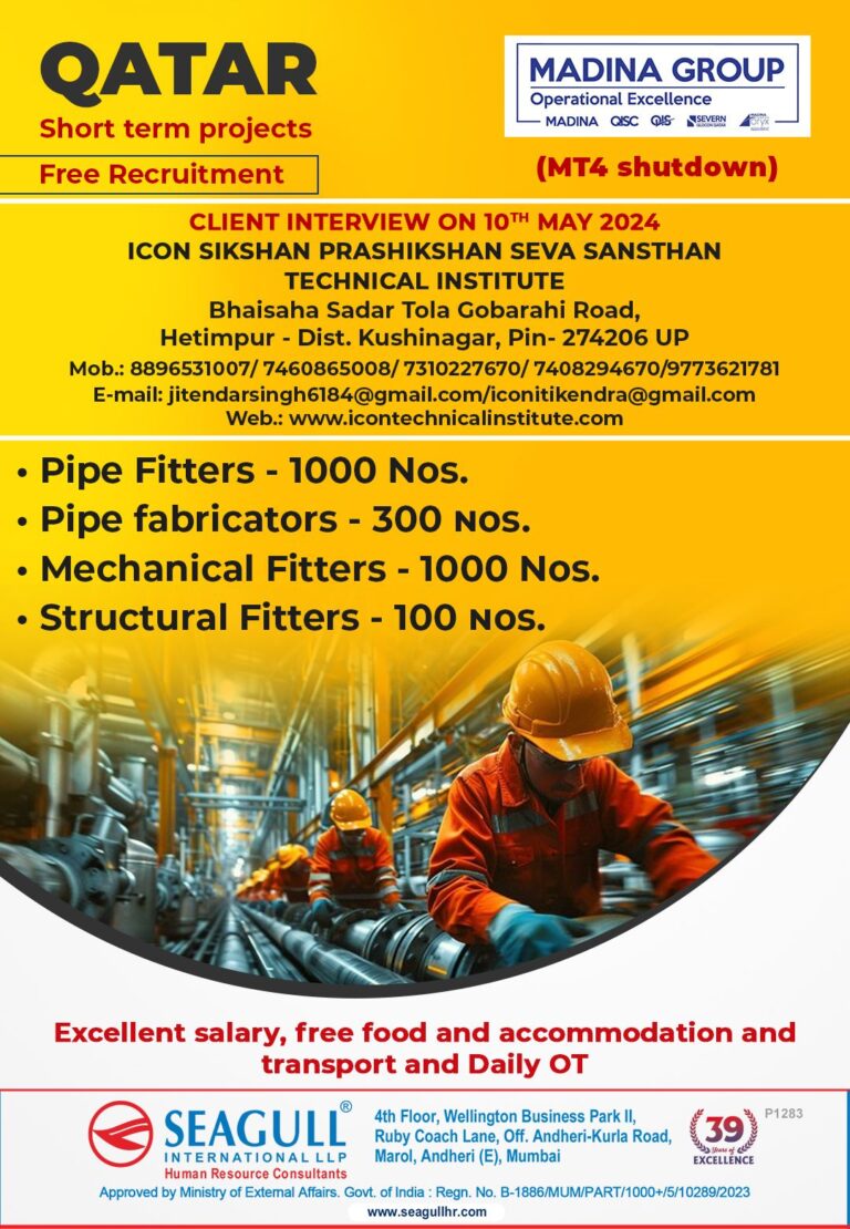 QATAR QconMT4 – Short-term Projects / Free Recruitment / Large RequirementsClient interview shortly at JamnagarSUPERVISOR (MECHANICAL)SUPERVISOR (PIPING)SUPERVISOR (RIGGING)SUPERVISOR (WELDING)FOREMAN / …