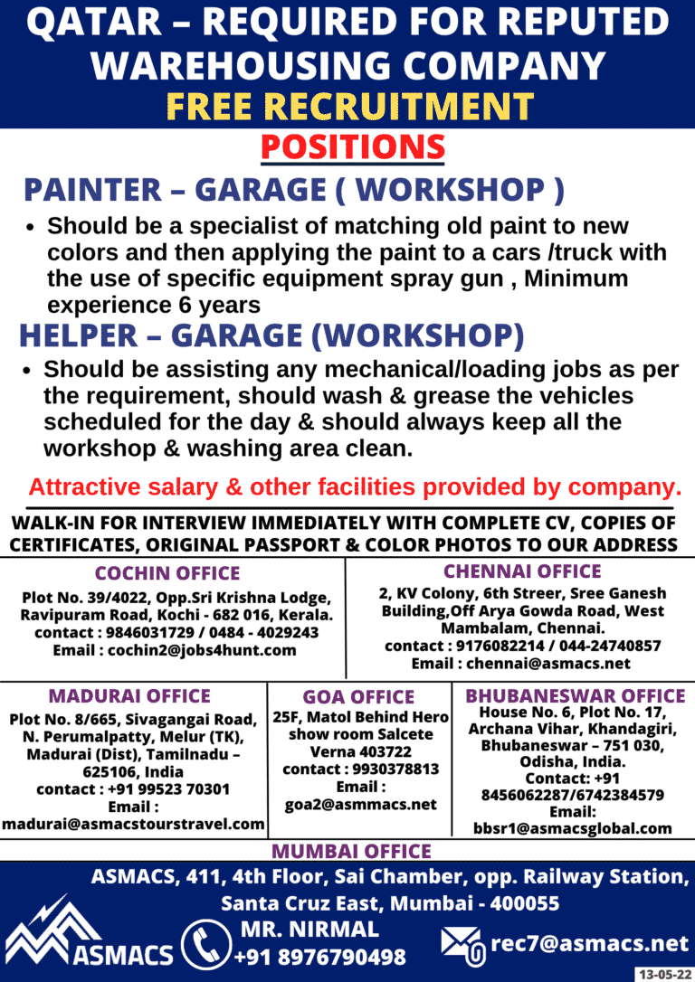 QATAR – REQUIRED FOR REPUTEDWAREHOUSING COMPANYFREE RECRUITMENTPOSITIONSPAINTER – GARAGE ( WORKSHOP )• Should be a specialist of matching old paint …