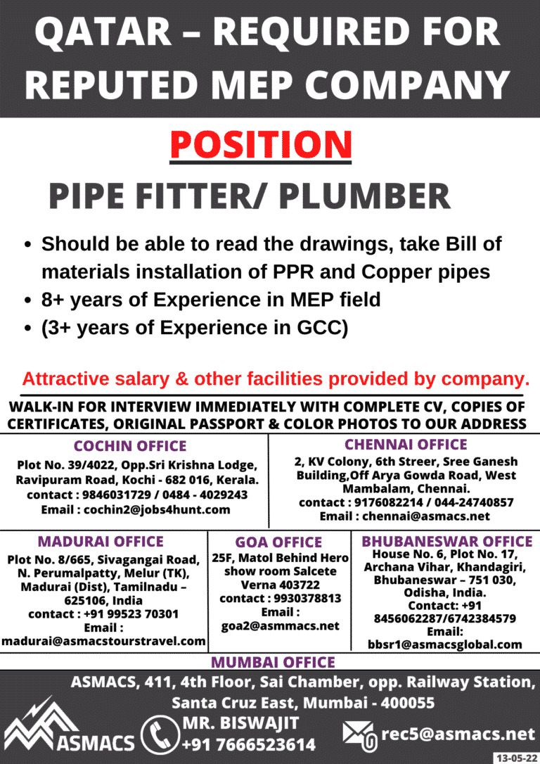 QATAR – REQUIRED FORREPUTED MEP COMPANYPOSITIONPIPE FITTER/ PLUMBER• Should be able to read the drawings, take Bill ofmaterials installation of …