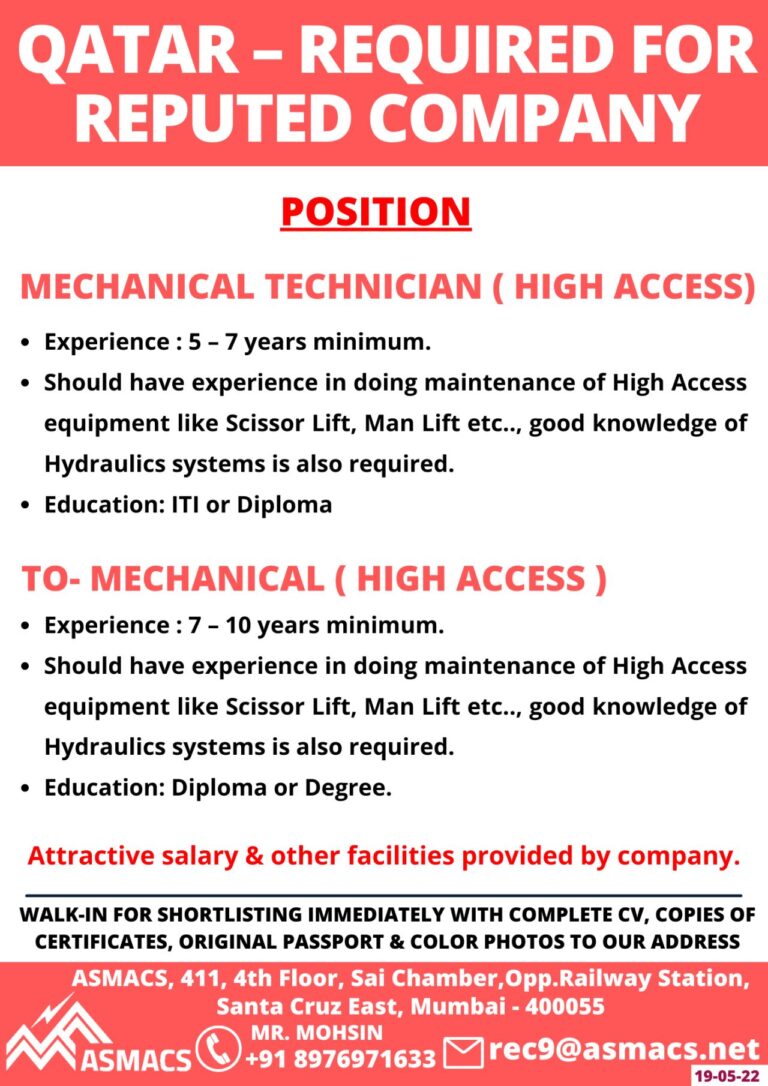 QATAR – REQUIRED FORREPUTED COMPANYPOSITIONMECHANICAL TECHNICIAN ( HIGH ACCESS)• Experience : 5-7 years minimum.• Should have experience in doing maintenance …