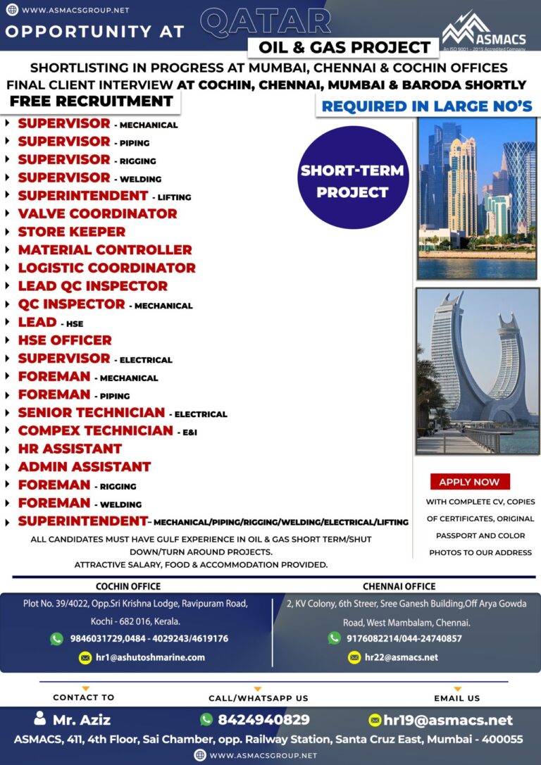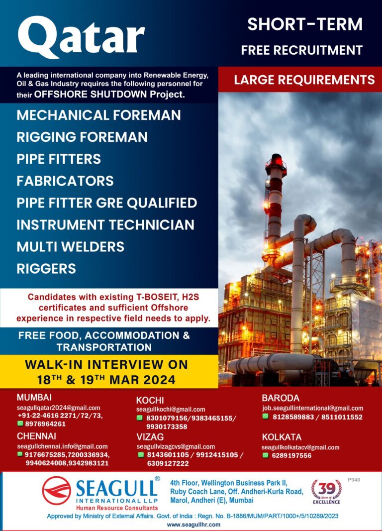 SHORT-TERMQatar FREE RECRUITMENTOil Gas Industry requires the following personnelfor’LARGE REQUIREMENTStheir OFFSHORE SHUTDOWN Project.MECHANICAL FOREMANRIGGING FOREMANPIPE FITTERSFABRICATORSPIPE FITTER GRE QUALIFIEDINSTRUMENT TECHNICIANMULTI …