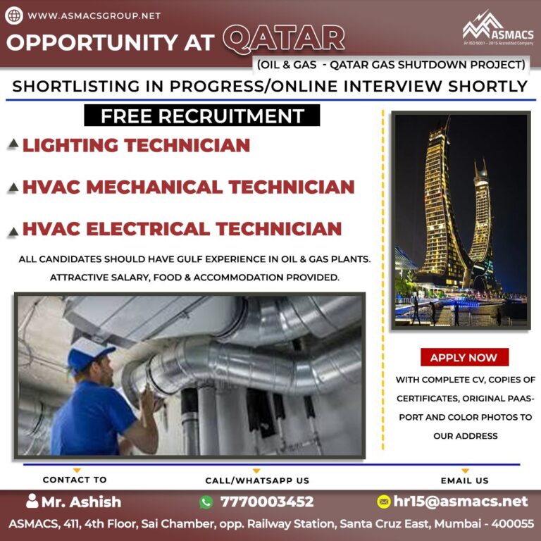 OPPORTUNITY AT QATAR(OIL & GAS – QATAR GAS SHUTDOWN PROJECT)SHORTLISTING IN PROGRESS/ONLINE INTERVIEW SHORTLYFREE RECRUITMENTA LIGHTING TECHNICIANAHVAC MECHANICAL TECHNICIANAHVAC ELECTRICAL …